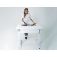 Ekran wykonany ze szkła hartowanego zapewnia bezpieczeństwo oraz wysoką jakość obrazu. Regulacja wysokości i kąta nachylenia (0°–70°) pozwala dopasować biurko do wzrostu i potrzeb użytkownika, również dzieci o specjalnych potrzebach edukacyjnych.