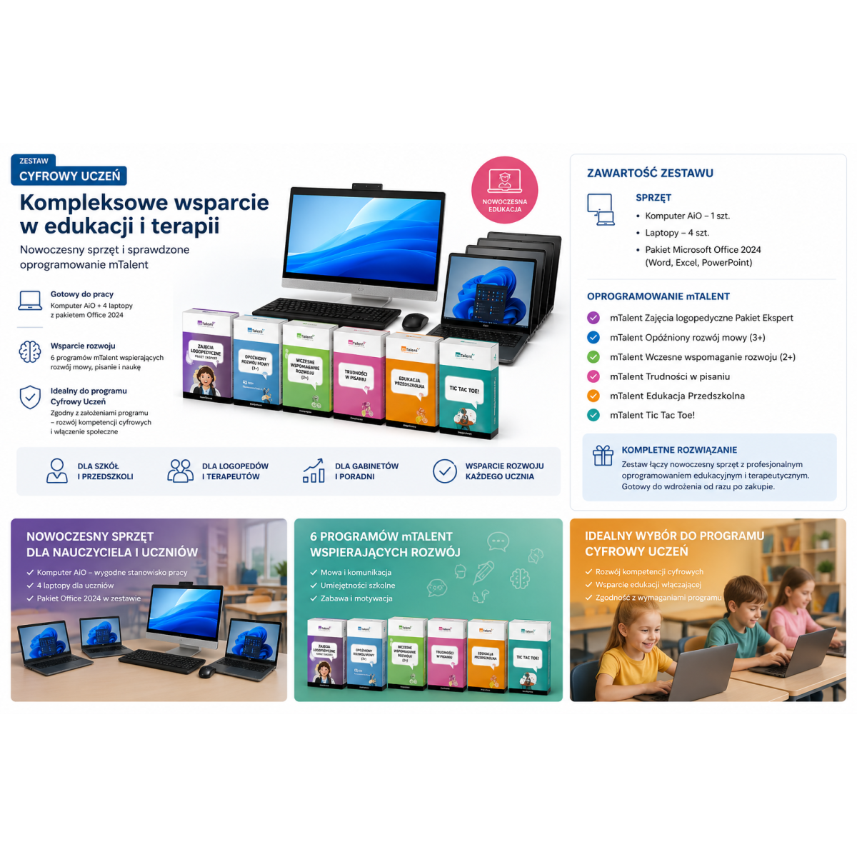 Zestaw idealnie wpisuje się w założenia programu „Cyfrowy Uczeń” – rozwija kompetencje cyfrowe, wspiera komunikację oraz umożliwia skuteczną pracę z uczniami o zróżnicowanych potrzebach.
