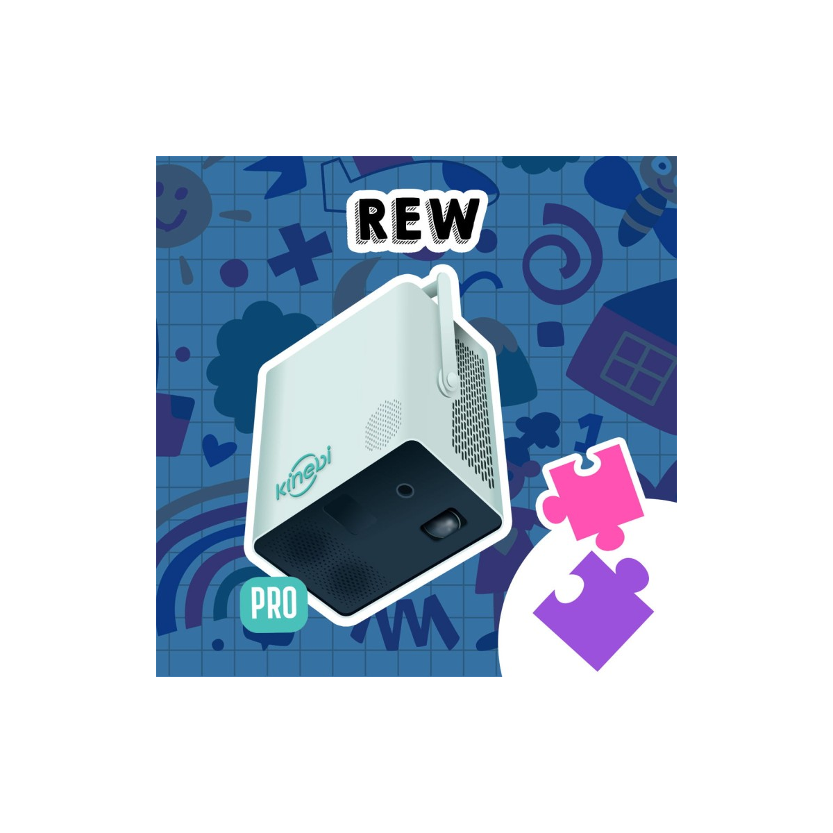 Magiczny Dywan Kinebi 5.0 Pro REW – PC z oprogramowaniem systemowym wraz z projektorem (FHD-LED), czujnikiem ruchu, WiFi, ramieniem obrotowym umożliwiającym projekcję na ścianę. W zestawie pakiet 10 aplikacji i gier EVO "START" oraz dedykowany pakiet 16 aplikacji rewalidacyjnych dla dzieci ze specjalnymi potrzebami edukacyjnymi REW.
