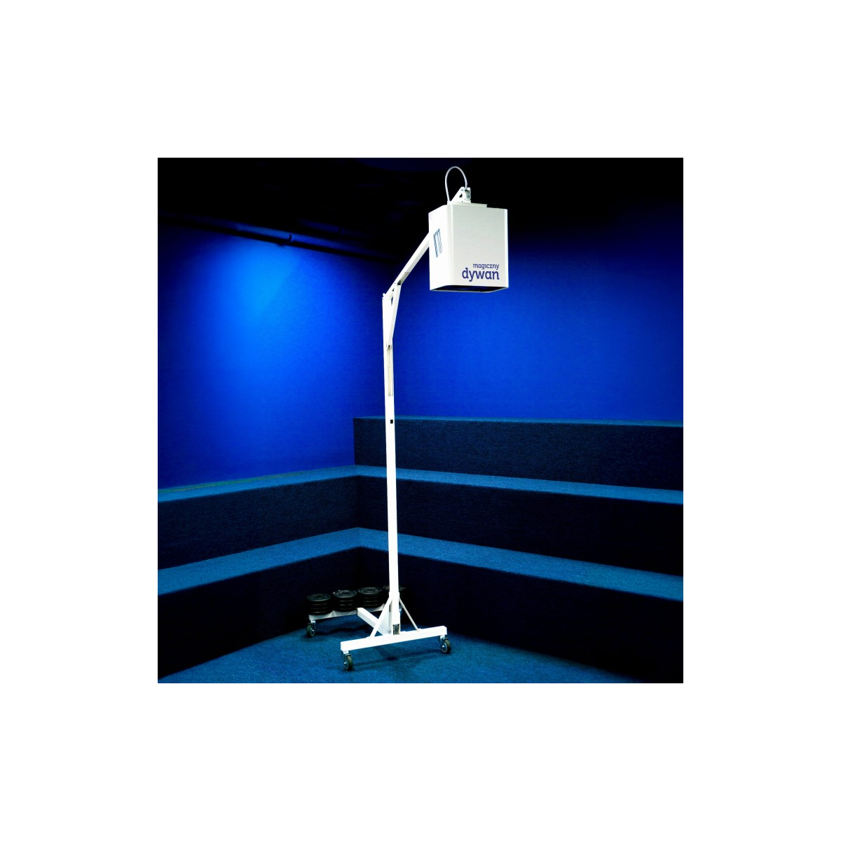 Mobilny wieszak do podłogi interaktywnej Magiczny Dywan, jest praktycznym uzupełnieniem i/lub alternatywą do trwałego sufitowego montażu urządzenia. Mobilność wieszaka opiera się na solidnej podstawie wyposażonej w obrotowe kółka, co umożliwia użytkownikom łatwe transportowanie podłogi interaktywnej w dowolne miejsce. To nowatorskie rozwiązanie zapewnia elastyczne adoptowanie się do różnorodnych przestrzeni wymagających swobodnej mobilności i wszechstronnej funkcjonalności.